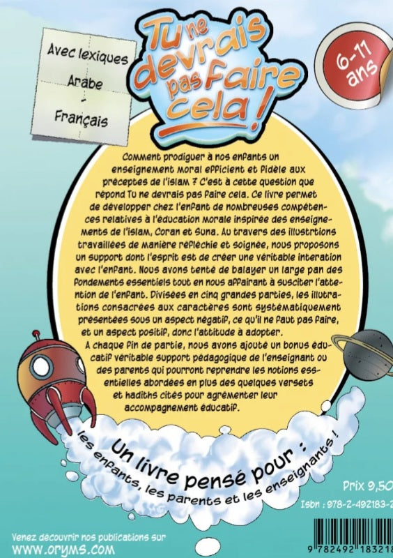 Dans le même esprit qui anime les parutions des éditons Oryms à destination des enfants et des adolescents (la saga Saladin remonte le temps à la rencontre de l’histoire et ses 7 tomes, ou Quand je serai grand inchaAllah) le présent livre, Tu ne devrais pas faire cela, est un moyen ludique d’aborder l’éducation morale sous un angle différent de ce qui peut exister aujourd’hui.