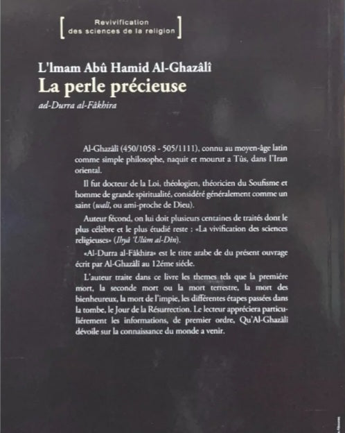 La Perle Précieuse (Ad-Dourra al-Fakhira) est un des derniers écrits de Ghazalî (1085-1111). Ce dernier traite dans cet ouvrage, fait assez exceptionnel en Islam, des enseignements relatifs à la vie future, dévoilant pour le croyant la connaissance du monde à venir. La Dourra véritable « livre des morts musulmans» à été fréquemment lue et copiée, pour de nombreux lecteurs passés, présents et futurs, elle a été, et sera réellement une « perle précieuse». .
