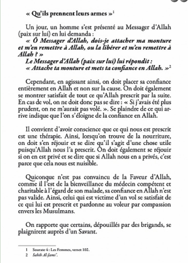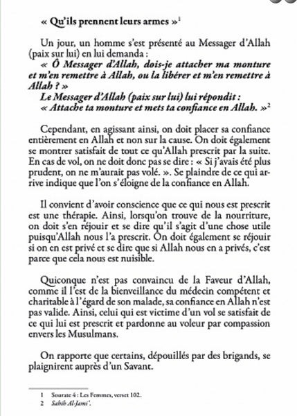 Quiconque n’est pas convaincu de la faveur d’Allah, comme il l’est de la bienveillance du médecin compétent et charitable à l’égard de son malade, sa confiance en Allah n’est pas valide. Ainsi, celui qui est par exemple victime d’un vol se satisfait de ce qui lui est prescrit et pardonne au voleur par compassion envers les Musulmans.