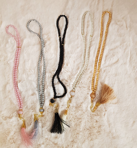 Magnifique tasbih de luxe disponible en 5 couleurs blanc, rose, doré, gris et noir.